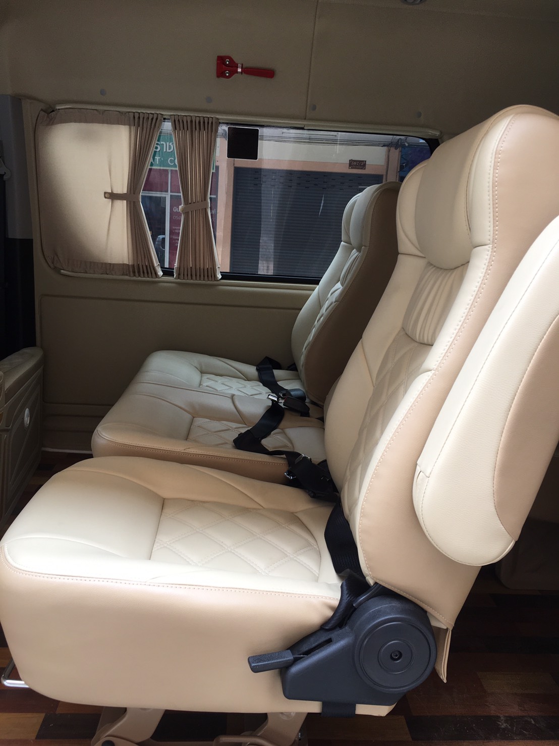 | อุปกรณ์ภายในรถ | - มีฉากกั้นระหว่างคนขับและผู้โดยสาร - ที่วางแก้วน้ำ และพื้นที่เก็บของใต้ที่นั่งด้านหน้า สะดวกสบาย ตอบโจทย์การใช้งาน - พื้นที่ห้องโดยสารกว้างขวาง สะดวกสบายด้วยเบาะโดยสาร 11 ที่นั่ง - FM/AM Radio - USB/AUX - CD/MP3 |